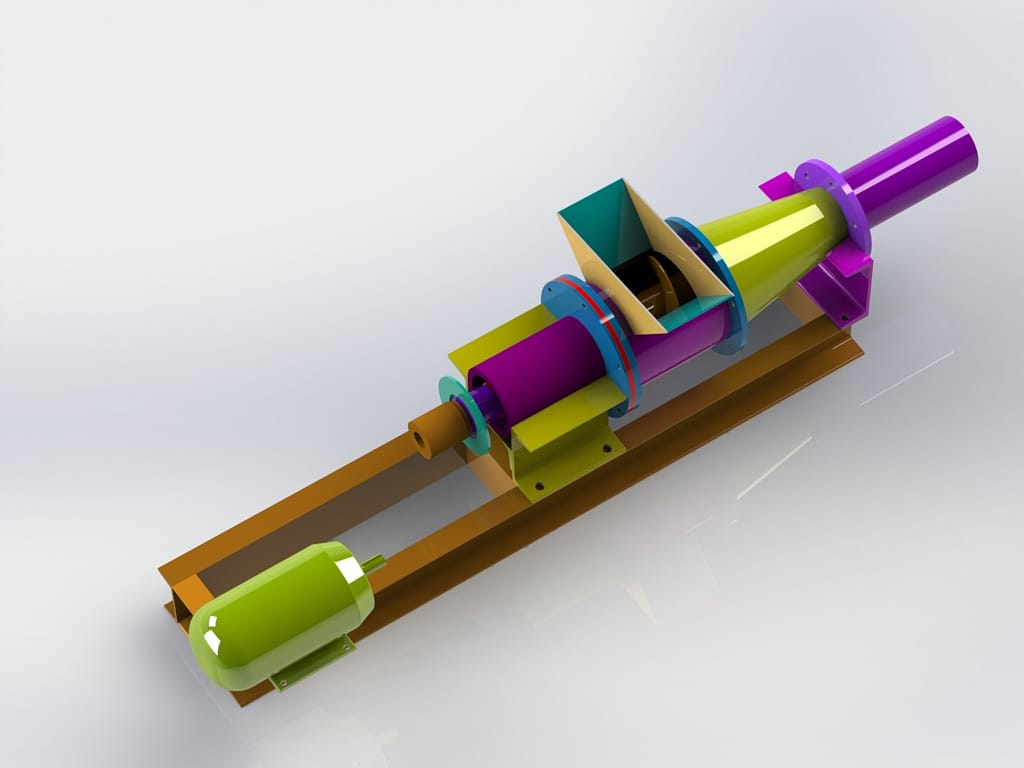 Шнековый пресс для получения брикетов из подсолнечной шелухи. Заказчики — грибной цех в Новой Водолаге в помещениях старых овощных складов неподалёку от железнодорожного вокзала. Устройство работало, я его там на месте сдавал. Дальнейшую судьбу производства не знаю. Полных чертежей по модели не делал, как и на большинство единичных изделий.