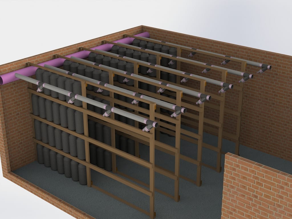 В 2005 году я спроектировал грибной цех или цех для выращивания вешенки. Она выращивалась в подвешенных мешках с субстратом. Основные цели были обеспечить тепловлажностной режим, а также вентиляцию. Иначе грибы, дышащие нижней частью шляпки стремясь увеличить площадь для дыхания, в условиях недостатка кислорода выворачивали шляпки принимая не товарный вид. На визуализации у меня изображена половина секций которые наполовину заполнены. Для наглядности. Доступ к верхним рядам был с передвижной стремянки на колёсах со стопором. Видны трубы вентиляции, климатическое оборудование стояло в соседнем помещении, теплообменники, увлажнители. Мною так-же было спроектировано и это оборудование, печь-котёл на твёрдом топливе, всё с аэродинамическим расчётом как самой печи так и вытяжки к ней, воздушных потоков в помещении для выращивании, общий тепловой расчёт помещения.