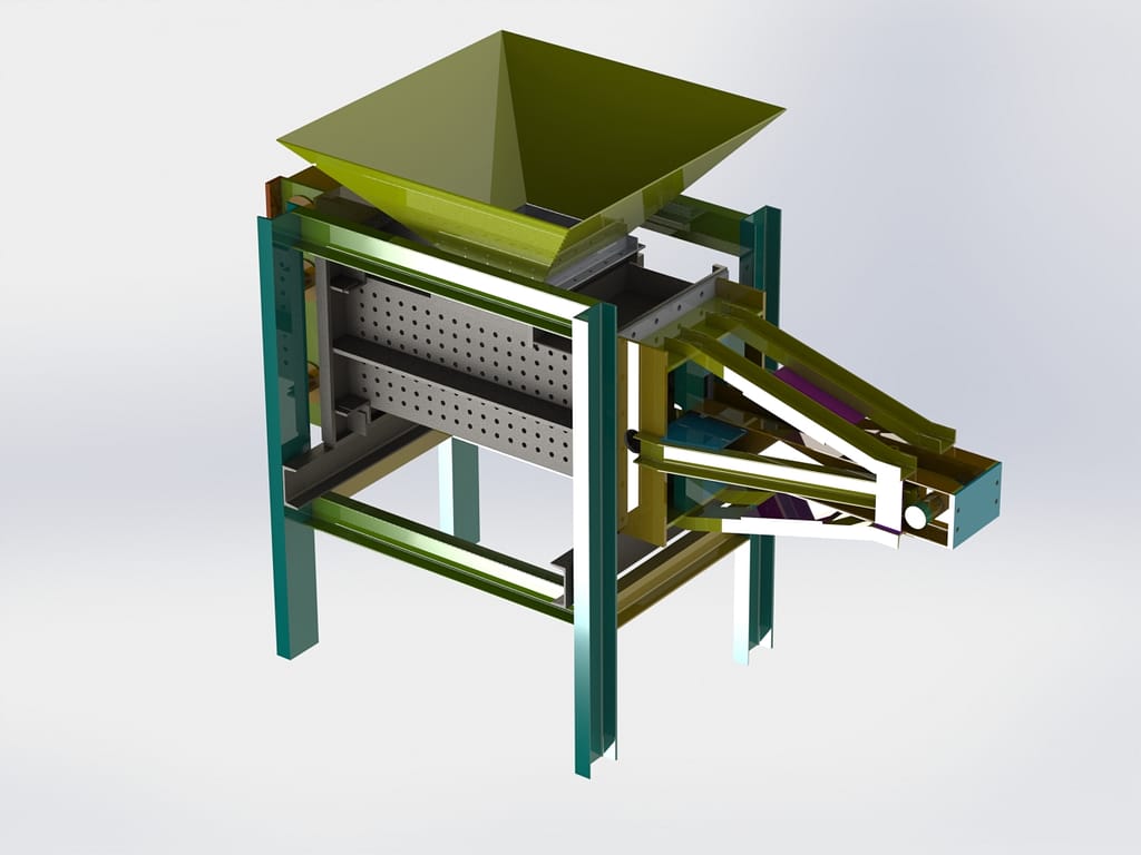 Для извлечения битума со старых кровель было создано данное устройство, куски кровли предварительно измельчались валами с «пальцами», прочность валов позволяла раздавливать попадающие куски кирпича, затем нагревались в небольшой печи предварительного подогрева, отходы кровли просто поджигались в печи с открывающимся днищем здесь не показанной и расположенной над приёмной воронкой устройства, а потом когда они достаточно разогревали сами себя низ печи открывался и они горящие падали в корзину пресса, низ печи закрывался, гидроцилиндр включался и отходы сдавливались в корзине с отверстиями поршнем на визуализации не показанном, так как он был готовым от какого то устройства изготовленного не нами, при этом горящие отходы потухали, а битум выдавливался в отверстия. Не плавящиеся материалы спрессовывались в плоский брикет который после открывания задней крышки выталкивался цилиндром, потом цилиндр втягивался и печь была готова к следующему циклу.