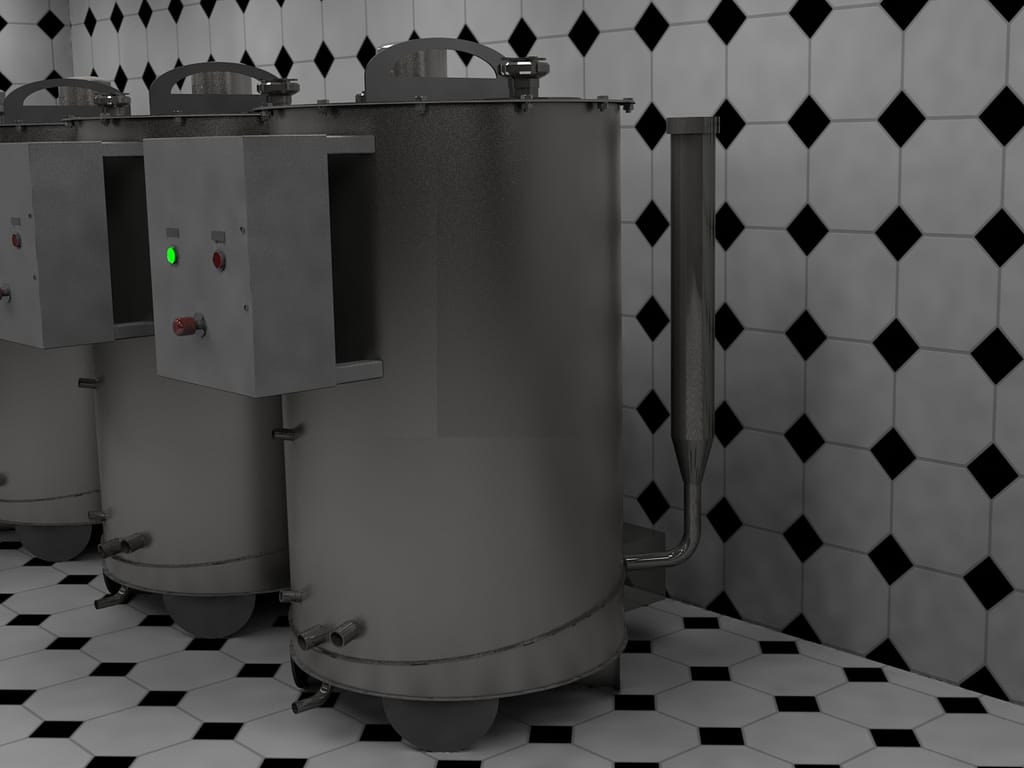 На производстве ООО «Нормаизол» используются пенополиуретановые плиты как промежуточное сырьё при изготовления различных видов теплоизоляции. Возникла необходимость в ёмкостях увеличенного объёма для исходных компонентов, в которых можно хранить компоненты нагретыми до необходимой температуры. Компонентов два, ёмкостей решили делать четыре чтобы был непрерывный цикл работы, две ёмкости стоят на подогреве, из двух компонент вырабатывается. Для равномерности нагрева используется промежуточный теплоноситель — масло. Объём с маслом снабжён расширительным бачком, а подсос воздуха в ёмкость с компонентом происходит через автомобильный фильтр. Коме выхода и з ёмкости и верхнего входа для заливки снабжённого сменным фильтром, есть вход с отводом внутри чтобы можно было обеспечить перемешивание компонента циркуляцией.