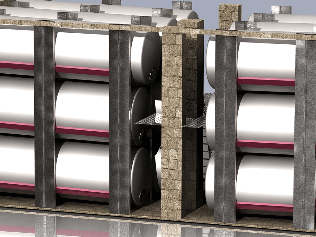 Бердичевский пивзавод один из оплотов традиционного пивоварения на Украине, единственное известное мне крупное предприятие сбраживающее пиво не в ЦКТ, а в открытых чанах решило заказать себе естественно горизонтальные лагерные ёмкости. После некоей переконфигурации завода освободилось помещение которое решили заполнить лагерными ёмкостями теплоизолировав стены. Помещение было высоким, ёмкости должны быть горизонтальным. Необходимо располагать в несколько этажей. Вообще были отработаны варианты и вертикальных, они были гораздо более дешёвыми, но пивовар запретил, решили что качество важнее. Вообще выбор геометрии ёмкостей дело многофакторное, есть геометрические размеры помещения, а есть объём варки задающийся параметрами варочного порядка, и объём лагерной ёмкости должен быть кратен объёму варки, иначе получится что какая та ёмкость будет заполнена скажем на треть и будет ожидать следующей варки, что неправильно с точки зрения технологии. Первый вариант одобренный пивоваром был такой. Там не прорисованы платформы меж этажные, до них не дошли как всё изменилось.